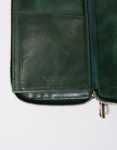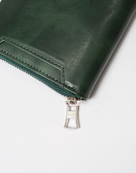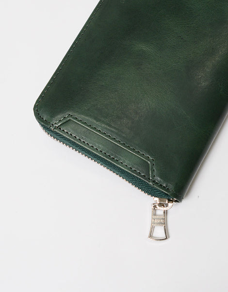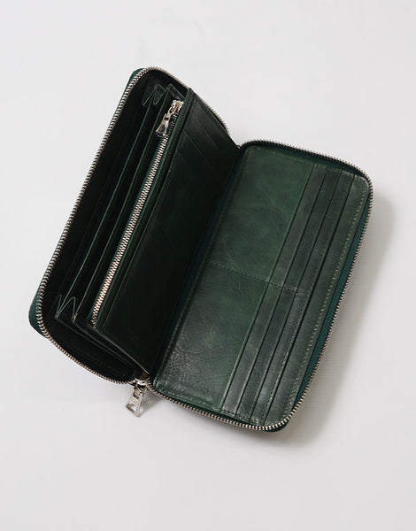 After dyeing the surface of the kip leather tanned with vegetable tannin with a dye, the wax is carefully applied by hand, and the heat is applied at the finish to add heat to the surface of the leather. Masu. Because it is a kip leather, the texture is fine, and if you use a lot of wax on it, it is a leather that can enjoy aging due to the depth and depth of the color and depth. The zipper uses EXCELLA made by YKK, which is carefully polished one by one. The IC card can be put in the front in common with all types.| Size | W195 H103 D25 M |