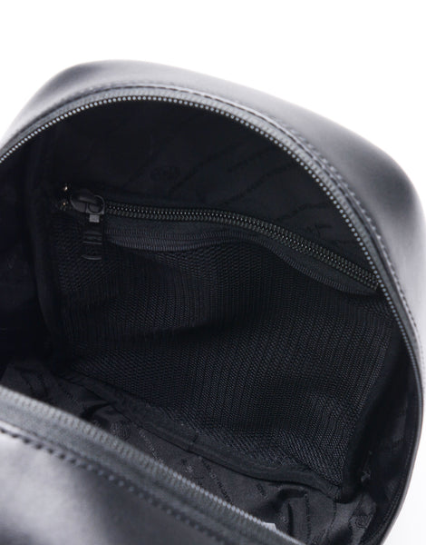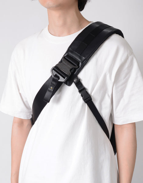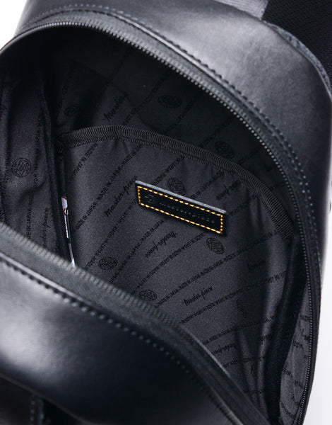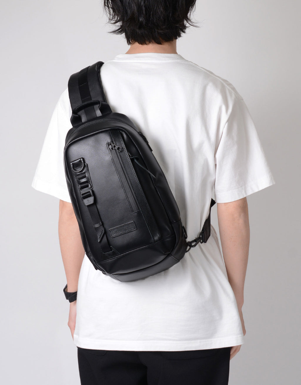 バックルなどインパクトある付属装備に実用性を考えた細かいコンパートメントを搭載したスリングバッグ。