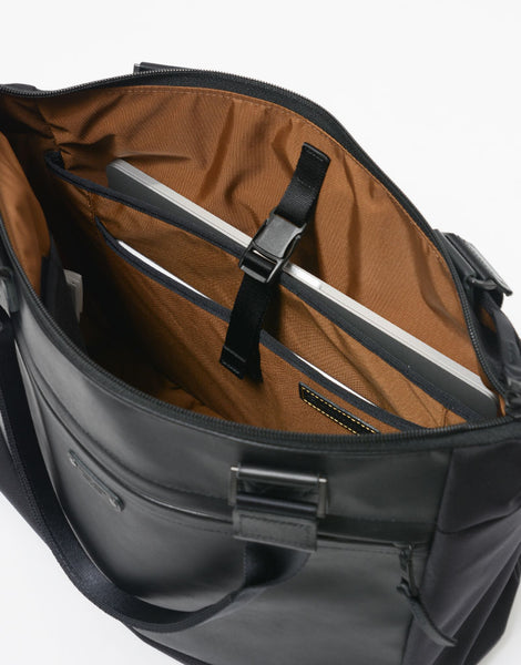 ミリタリーテイストな面構えとフロント部分に大きく使用されたレザーの組み合わせが印象的なシリーズSPEC(スペック)。こちらはmaster-piece ONLINE STORE、直営店限定のアイテムとなります。防水性、耐久性に優れた素材を使用しており、オールブラックのシンプルなデザイン性、PCやタブレットがすっぽりと収まるサイズ感の2WAYトートバッグは上品さとともに機能性も優れています。豊富に設けられた収納は、タウンユースはもちろん、ビジネスシーンやトラベルにも適用しており、様々なライフスタイルをフォローします。