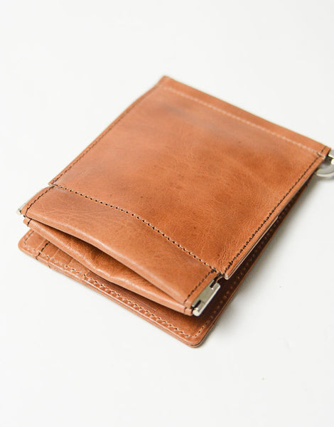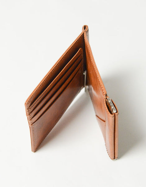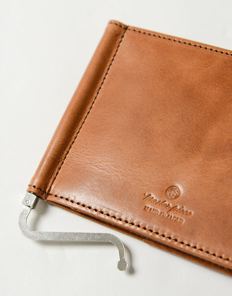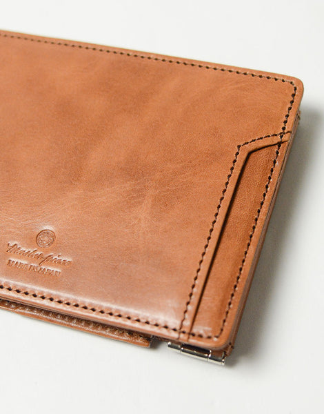 本体素材にはベジタブルタンニンで鞣されたキップレザーの表面を染料で染めた後、ワックスを手作業で丁寧に塗り込み、仕上の段階で熱を加える事により革の表面に濃淡のコントラストを出しています。キップレザーのためキメが細かく、その上にワックスを多く使用する事により磨くと色の深さや奥行きが出て経年変化が楽しめる革に仕上がっています。 ファスナーはエレメントひとつひとつ全面に入念な磨きをかけたYKK社製のEXCELLAを使用。全型共通で前面にICカードが入れられる仕様になっています。