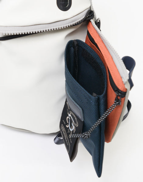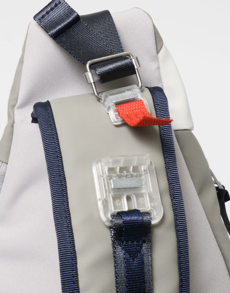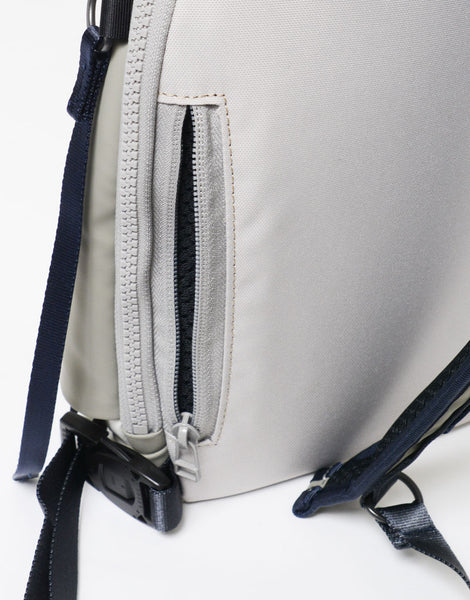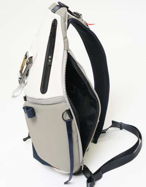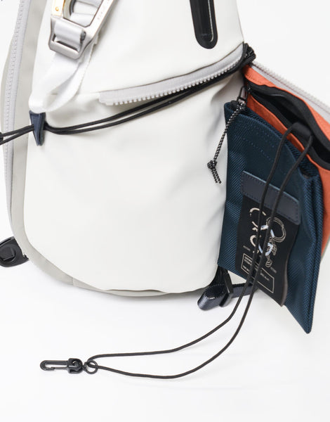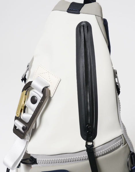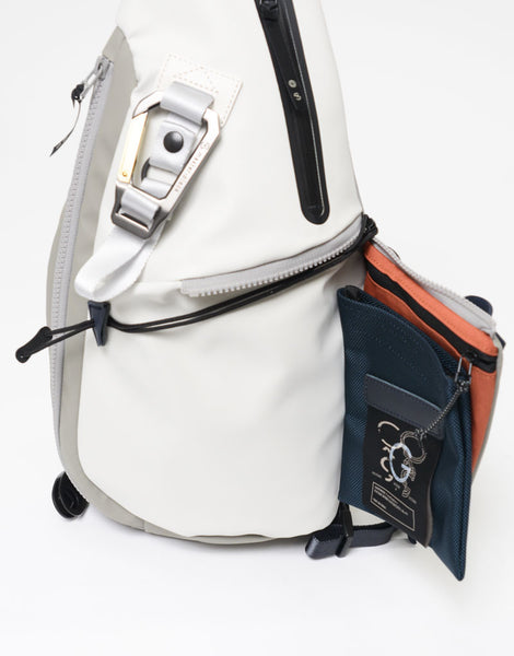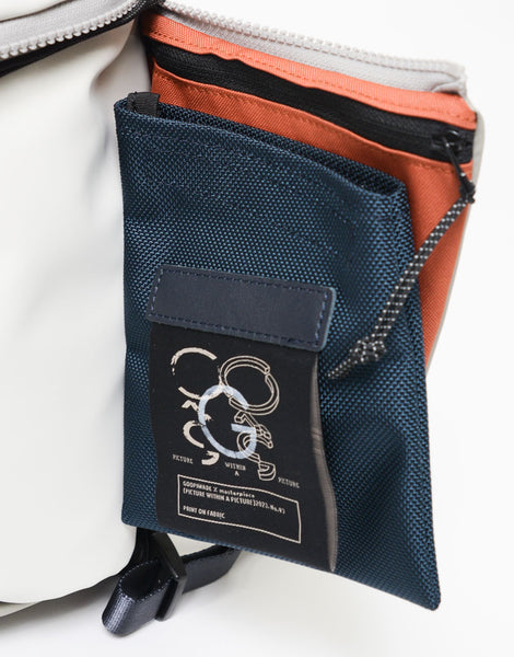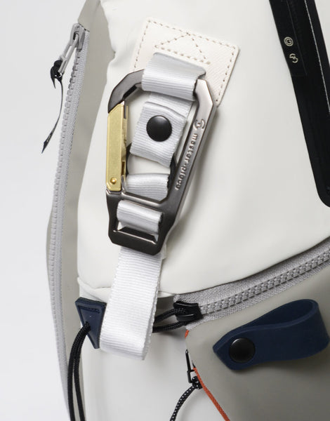 主体材料由 600D 聚酯纤维制成,涂有环保、高耐用的聚氨酯,消除了约 90% 造成环境污染的溶剂,赋予其独特的哑光、橡胶般的氛围。口袋所用的配件面料是英威达的 1680d Cordura Ballistic® 尼龙,其磨损强度和耐用性约为普通尼龙的五倍。手柄上有带有高密度合作标志的编织名称,附带的硅胶部件也是原装的。此外,橡胶板边缘的储物室采用透湿防水面料制成,具有高防水规格,并具有通过从前拉链延伸的尼龙绳可以顺利开合的机构。这是与 Goopy Made 合作制作的特殊型号,配有标准型号中未使用的原始登山扣和编织名称等部件。