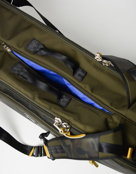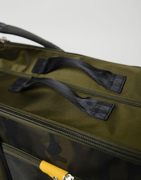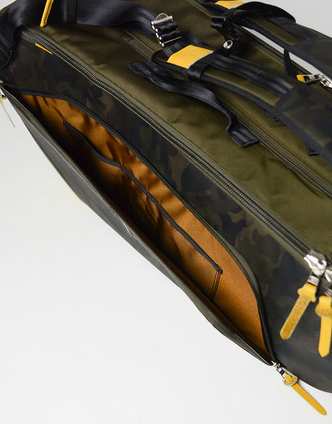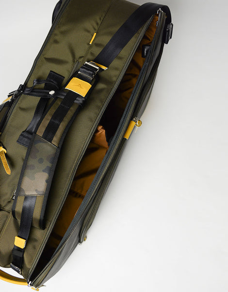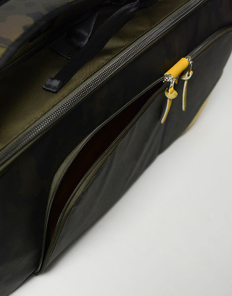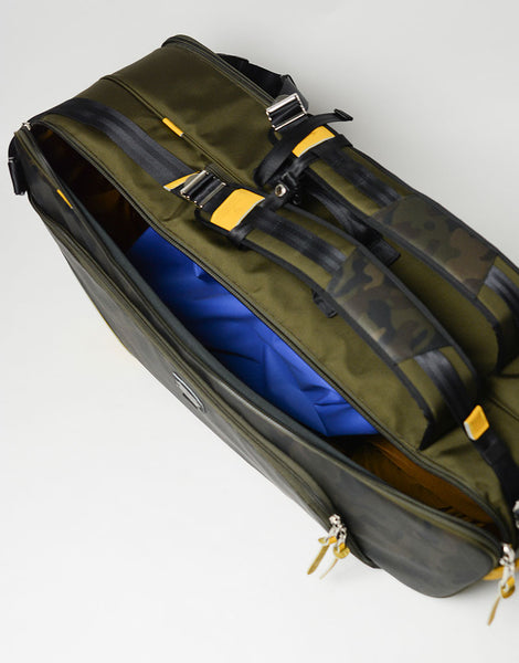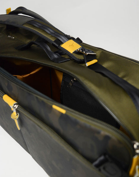 主体面料为300D涤纶,印有大师级原创迷彩,表面涂有0.4mm环保彩色非邻苯二甲酸酯PVC。此外,织物经过压花和染色处理,使其看起来非常深邃。随附的面料为 CORDURA Ballistic® 面料 1680d 尼龙,比普通尼龙更耐用,并且耐摩擦和撕裂。通过纵向排列840d、横向排列两根840d的捻线,使织物具有更强的摩擦力和撕裂强度。附带的皮革是MIZUNO棒球手套中使用的手套皮革。原皮主要是来自亚利桑那州的小牛皮。虽然是铬鞣的,但厚实、轻便,并具有独特的弹性。它需要具有耐久性和耐热性等各种性能,并且还具有良好的显色性,并且由于没有芯,因此颜色与皮革的横截面相匹配。此外,由于采用裸色处理,因此您可以享受皮革的自然老化。 NO.02180-MZ 是一款可容纳 6 个球拍的包。除了存放鞋子外,隔层为两层,常见的情况是一侧存放三支球拍,另一侧存放换洗的衣服。除了存放鞋子之外,NO.NO.02181-MZ背包的背面可以容纳两支球拍,但大多数时候它只能容纳一支球拍。通常情况下,您可以将笔记本电脑存放在其中,四个拉链滑块可以轻松从顶部或侧面取放。这是一款新型球拍包系列,将杰作的时尚性和功能性与 MIZUNO 的专业知识相结合。