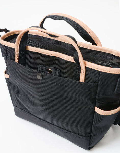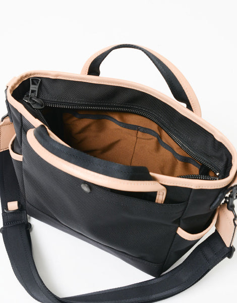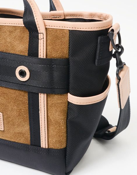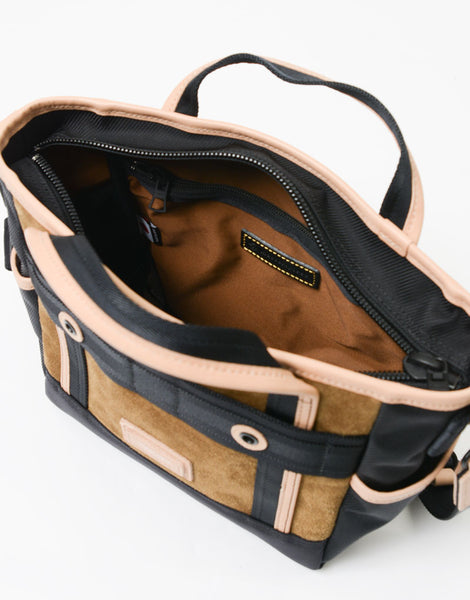 本体素材是东丽“法里罗”®」将强力捻成的1260d的线做成用于章鱼的粗垄的扭曲布料。法里罗® 是特殊中空构造的独特光泽感和手感的中空尼龙素材。与同样的1260d相比,即使轻量化20%以上,也会成为具有厚度适度的弹性的素材。完成后进行了防水加工。底面是CORDURA® 使用了brand fabric的Hollofil AirTM(66尼龙的中空线)的3层质地成为高耐久、高耐水的独创性。附带的麂皮是将北美产的厚的原皮用铬做成后,在圣托邦中仔细地进行起毛加工。为了使其厚度均匀,将染色工序分为2次实施,染色时含有防水剂使其浸渍,从而提高防水性。配置在软绵绵中的蕾丝用100%的丹宁,可以享受经年变化的厚度。将高强度、高防水材料组合成军装风味的泰西链上镶有眼线的棉纱。