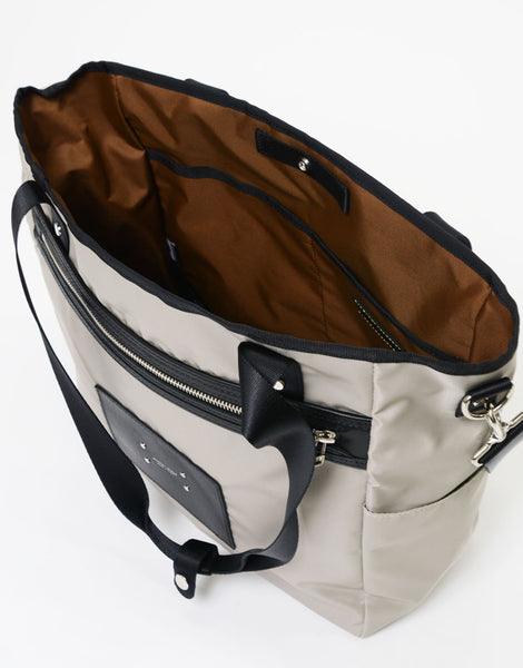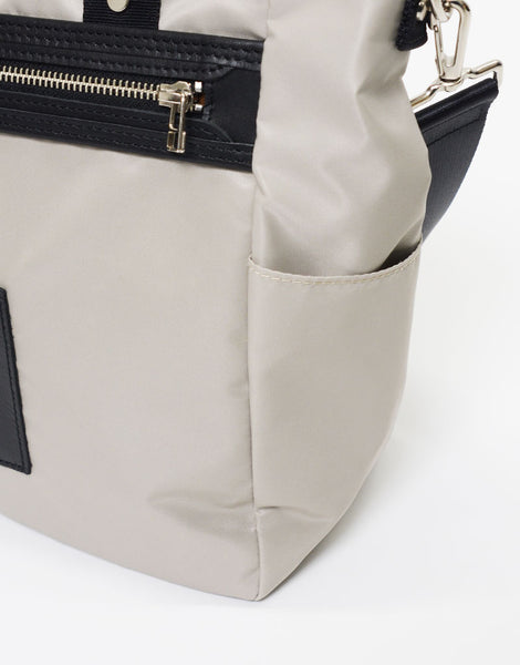 主体材质为斜纹材质,由经线70d、纬线210d的尼龙线密集编织而成,手感坚挺。这种尼龙斜纹布经过独创的防水整理剂m-coatTM处理,与传统整理剂相比,它具有远超传统整理剂的防水性和耐磨性。 m-coatTM采用先进的特殊涂层技术,在纤维表面构造拒水剂,实现优异的拒水性和耐久性。许多防水产品会因反复使用和洗涤而失去防水性能,但m-coatTM即使在洗涤100次后仍能获得Bundesmann防水测试4级。关于防水性,我们进行了Bundesmann测试(*),该测试比传统测量标准中使用的喷雾测试(JIS -L1092)更严格。配件材料采用优质国产皮革,在染色过程中加入了3M的防水材料“SCOTCHGARD®”,并进行整理,使防水材料融入到整个产品中,从而产生高度的质感。防水效果好,且效果持久。皮革表面采用染料和颜料,赋予其透明又自然的色调和氛围,然后在表面喷洒防水剂,使其更加防水。这是一款通过“SCOTCHGARD®”监测测试的防水、防污、防油皮革。主体材料和附属皮革均具有防水功能,是一个休闲系列,可用于带有金属部件的男女通用时尚。 *Bundesmann测试是针对一般服装产品(包括防水面料)抗降雨的准实用测试方法。与喷雾测试(JIS-L1092)相比,Bundesmann测试是测试一般服装产品(包括防水面料)的方法,防雨,测试时间超过9分钟。