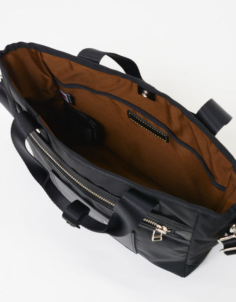 主体材质为斜纹材质,由经线70d、纬线210d的尼龙线密集编织而成,手感坚挺。这种尼龙斜纹布经过独创的防水整理剂m-coatTM处理,与传统整理剂相比,它具有远超传统整理剂的防水性和耐磨性。 m-coatTM采用先进的特殊涂层技术,在纤维表面构造拒水剂,实现优异的拒水性和耐久性。许多防水产品会因反复使用和洗涤而失去防水性能,但m-coatTM即使在洗涤100次后仍能获得Bundesmann防水测试4级。关于防水性,我们进行了Bundesmann测试(*),该测试比传统测量标准中使用的喷雾测试(JIS -L1092)更严格。配件材料采用优质国产皮革,在染色过程中加入了3M的防水材料“SCOTCHGARD®”,并进行整理,使防水材料融入到整个产品中,从而产生高度的质感。防水效果好,且效果持久。皮革表面采用染料和颜料,赋予其透明又自然的色调和氛围,然后在表面喷洒防水剂,使其更加防水。这是一款通过“SCOTCHGARD®”监测测试的防水、防污、防油皮革。主体材料和附属皮革均具有防水功能,是一个休闲系列,可用于带有金属部件的男女通用时尚。 *Bundesmann测试是针对一般服装产品(包括防水面料)抗降雨的准实用测试方法。与喷雾测试(JIS-L1092)相比,Bundesmann测试是测试一般服装产品(包括防水面料)的方法,防雨,测试时间超过9分钟。