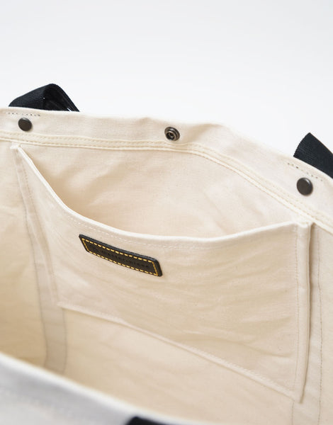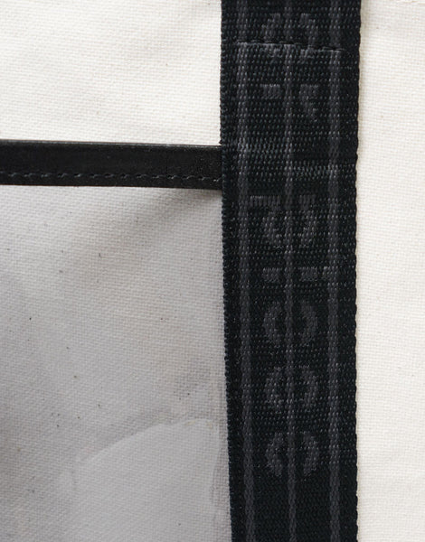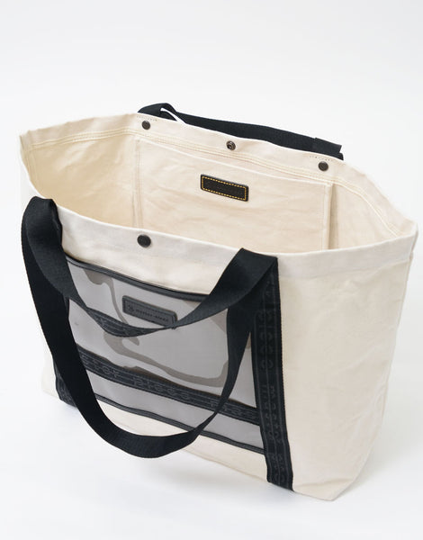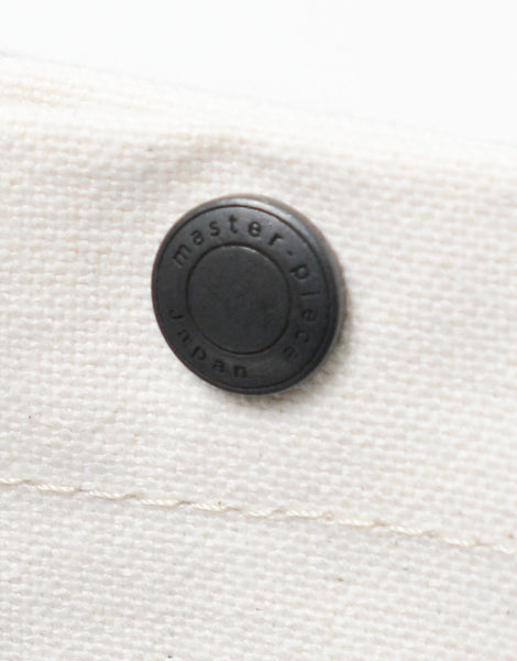 主体材料是在旧有梭织机上超高密度织造的色织布边 8 号帆布,并通过插入 33 根纬线(而不是通常的 25 根),实现了有梭织机特有的厚度。材料就是这种材料的另一个特点是,它具有石蜡加工的感觉,这是通过对线进行染色,然后用特殊的油浸渍来实现的,从而形成具有油/石蜡加工触感的材料。捻线、染色、编织、后整理全部由熟练的工匠在仓敷市儿岛完成,但这种材料一天只能编织 50 米,因此无法大量生产。附带的透明薄膜是冈本株式会社静冈工厂生产的国产彩色薄膜。所附皮革经过日本皮革技术协会13项标准的有害物质测试(JES),不使用任何对人体有害的物质六价铬,采用生态牛皮鞣制而成与植物单宁..这是男女皆宜的休闲系列,尺寸范围广泛,并以原创徽标带作为点缀。