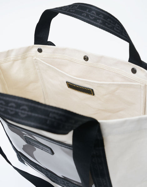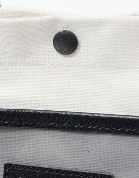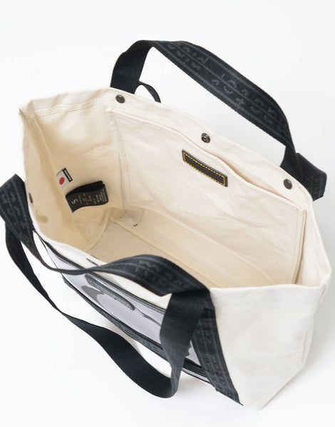 主体材料是在旧有梭织机上超高密度织造的色织布边 8 号帆布,并通过插入 33 根纬线(而不是通常的 25 根),实现了有梭织机特有的厚度。材料就是这种材料的另一个特点是,它具有石蜡加工的感觉,这是通过对线进行染色,然后用特殊的油浸渍来实现的,从而形成具有油/石蜡加工触感的材料。捻线、染色、编织、后整理全部由熟练的工匠在仓敷市儿岛完成,但这种材料一天只能编织 50 米,因此无法大量生产。附带的透明薄膜是冈本株式会社静冈工厂生产的国产彩色薄膜。所附皮革经过日本皮革技术协会13项标准的有害物质测试(JES),不使用任何对人体有害的物质六价铬,采用生态牛皮鞣制而成与植物单宁..这是男女皆宜的休闲系列,尺寸范围广泛,并以原创徽标带作为点缀。