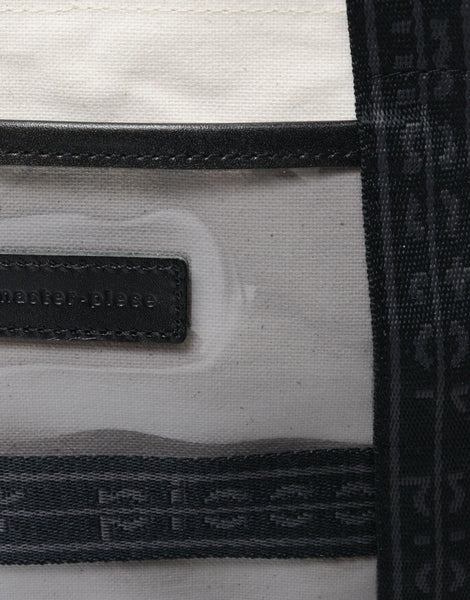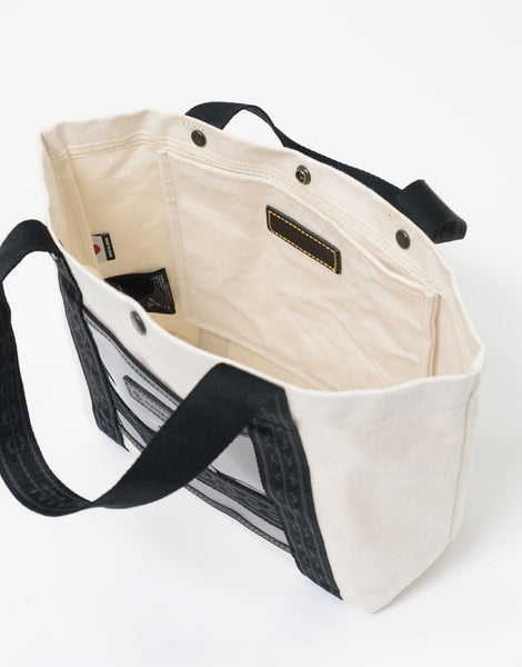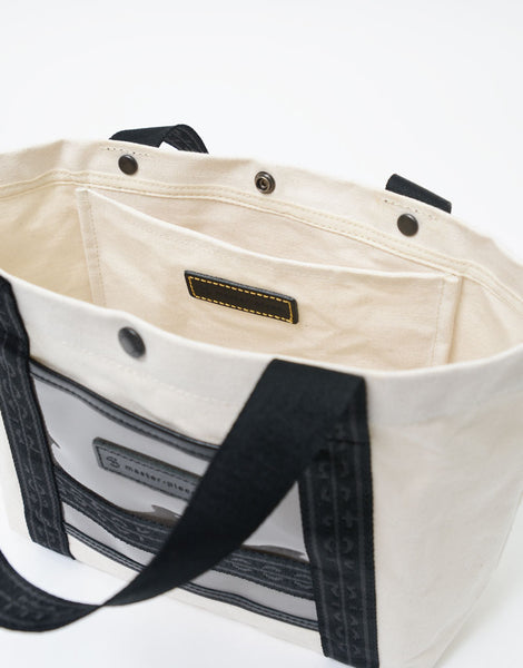 主体材料是在旧有梭织机上超高密度织造的色织布边 8 号帆布,并通过插入 33 根纬线(而不是通常的 25 根),实现了有梭织机特有的厚度。材料就是这种材料的另一个特点是,它具有石蜡加工的感觉,这是通过对线进行染色,然后用特殊的油浸渍来实现的,从而形成具有油/石蜡加工触感的材料。捻线、染色、编织、后整理全部由熟练的工匠在仓敷市儿岛完成,但这种材料一天只能编织 50 米,因此无法大量生产。附带的透明薄膜是冈本株式会社静冈工厂生产的国产彩色薄膜。所附皮革经过日本皮革技术协会13项标准的有害物质测试(JES),不使用任何对人体有害的物质六价铬,采用生态牛皮鞣制而成与植物单宁..这是男女皆宜的休闲系列,尺寸范围广泛,并以原创徽标带作为点缀。