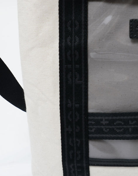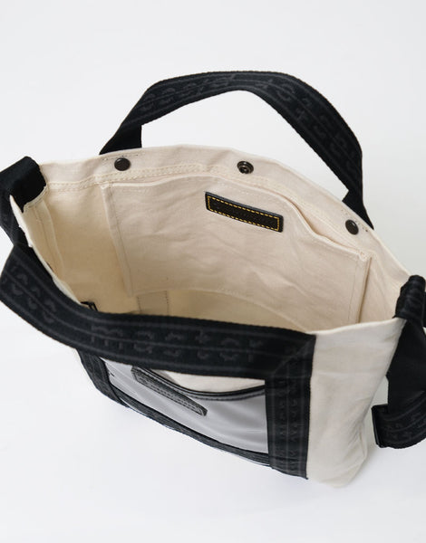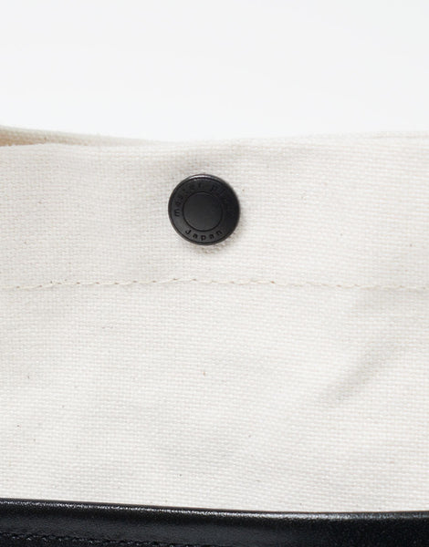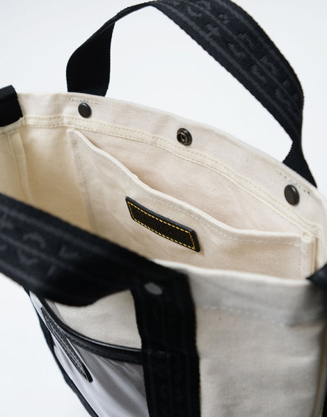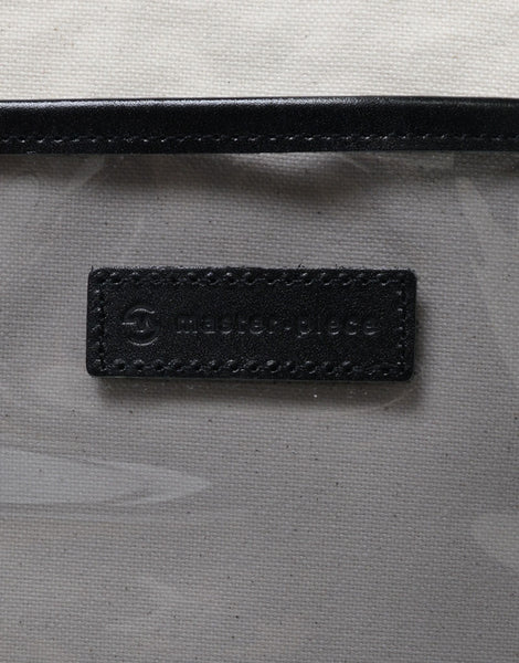 主体材料是在旧有梭织机上超高密度织造的色织布边 8 号帆布,并通过插入 33 根纬线(而不是通常的 25 根),实现了有梭织机特有的厚度。材料就是这种材料的另一个特点是,它具有石蜡加工的感觉,这是通过对线进行染色,然后用特殊的油浸渍来实现的,从而形成具有油/石蜡加工触感的材料。捻线、染色、编织、后整理全部由熟练的工匠在仓敷市儿岛完成,但这种材料一天只能编织 50 米,因此无法大量生产。附带的透明薄膜是冈本株式会社静冈工厂生产的国产彩色薄膜。所附皮革经过日本皮革技术协会13项标准的有害物质测试(JES),不使用任何对人体有害的物质六价铬,采用生态牛皮鞣制而成与植物单宁..这是男女皆宜的休闲系列,尺寸范围广泛,并以原创徽标带作为点缀。