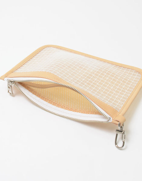 主体材料为透明PVC薄膜,与工厂帐篷使用的材料相同。普通透明PVC膜如果长时间暴露在紫外线下会很快变黄变硬,但这种面料采用耐候配方,所以即使在户外使用时暴露在紫外线下也不会变黄或变硬.经过处理可防止变形和硬化。另外,表面涂有氟树脂,不仅不易弄脏,而且与普通带线的透明薄膜不同,底布采用厚实、耐用、高强度的涤纶线,使其坚固性极佳。内饰采用尼龙网状材质,色彩与不同材质的结合营造出流行氛围。随附的皮革为生态牛皮革(NISSENKEN),由无害的植物单宁和植物油制成,重量轻,不含造成环境污染的化学物质和染料以及其他对人体有害的物质。通过 Oeko-Tex Standard 100 认证)。主体附有茄子环,因此您可以根据您的搭配和目的单独使用,也可以将其连接到其他包或肩带(单独出售),或者两个或多个一起使用,营造出不同的氛围。放在这里。